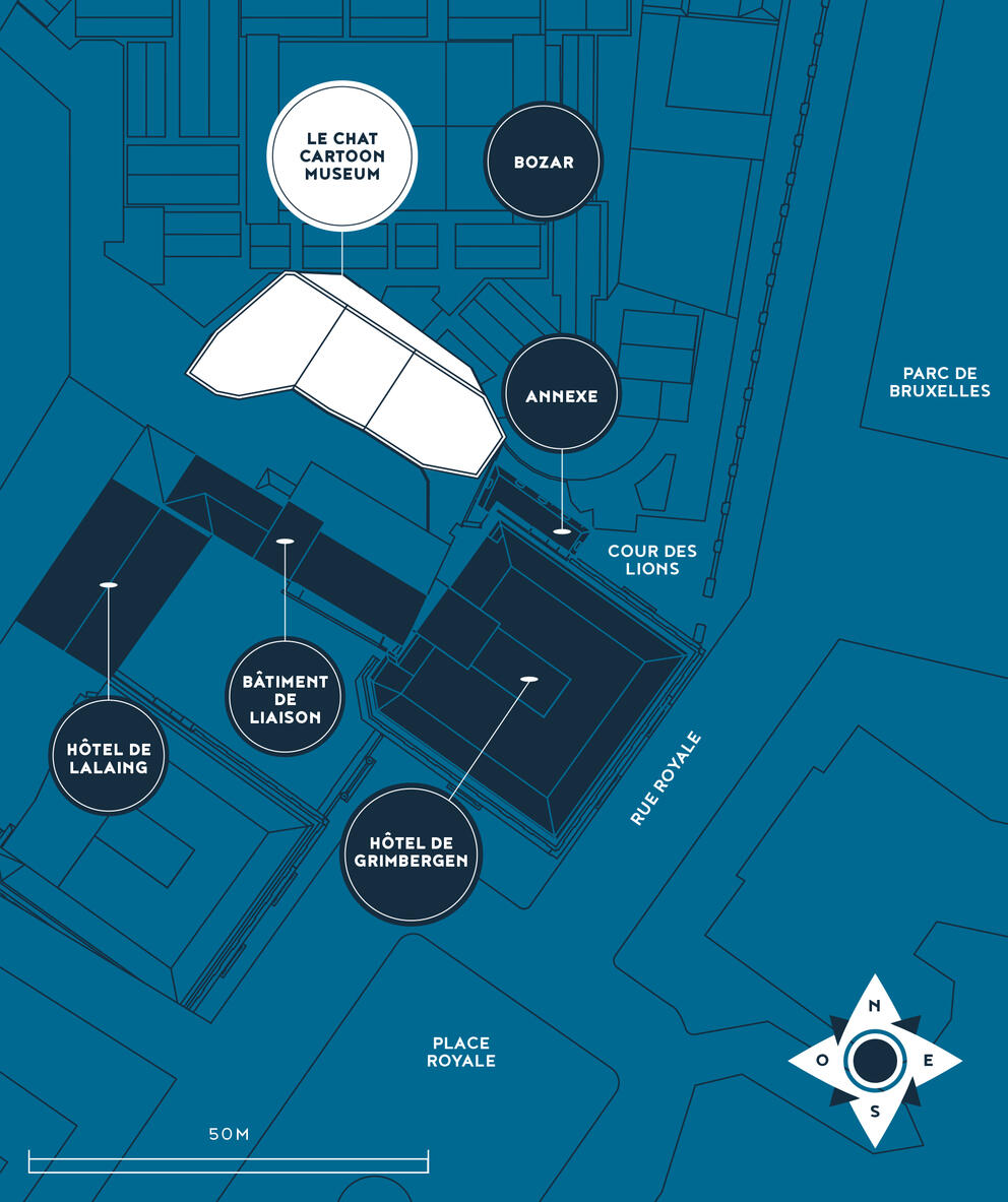 LE CHAT cartoon museum zal circa 4.000 m2 bruto-oppervlakte beslaan, verdeeld over 7 verdiepingen, waarvan 4 boven de grond. Na de bouw zal deze nieuwe culturele instelling toegankelijk zijn via de met twee leeuwen geflankeerde poort aan de Koningsstraat 6, de ingang van de Cour des Lions van het Bip.