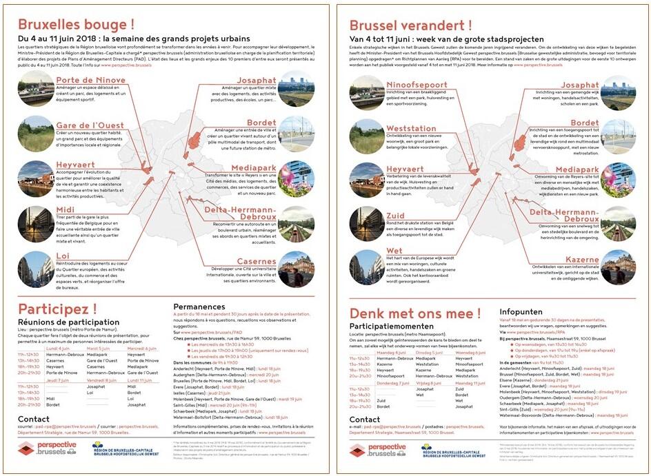 Onder meer op het programma van de week die perspective.brussels organiseert: participatiebijeenkomsten (in het eigen gebouw, Naamsestraat 59, 1000 Brussel), infopunten in het eigen gebouw en in de betrokken gemeenten (Anderlecht, Oudergem, Brussel, Evere, Elsene, Molenbeek, Sint-Gillis, Schaarbeek, Watermaal-Bosvoorde) en een infonummer.